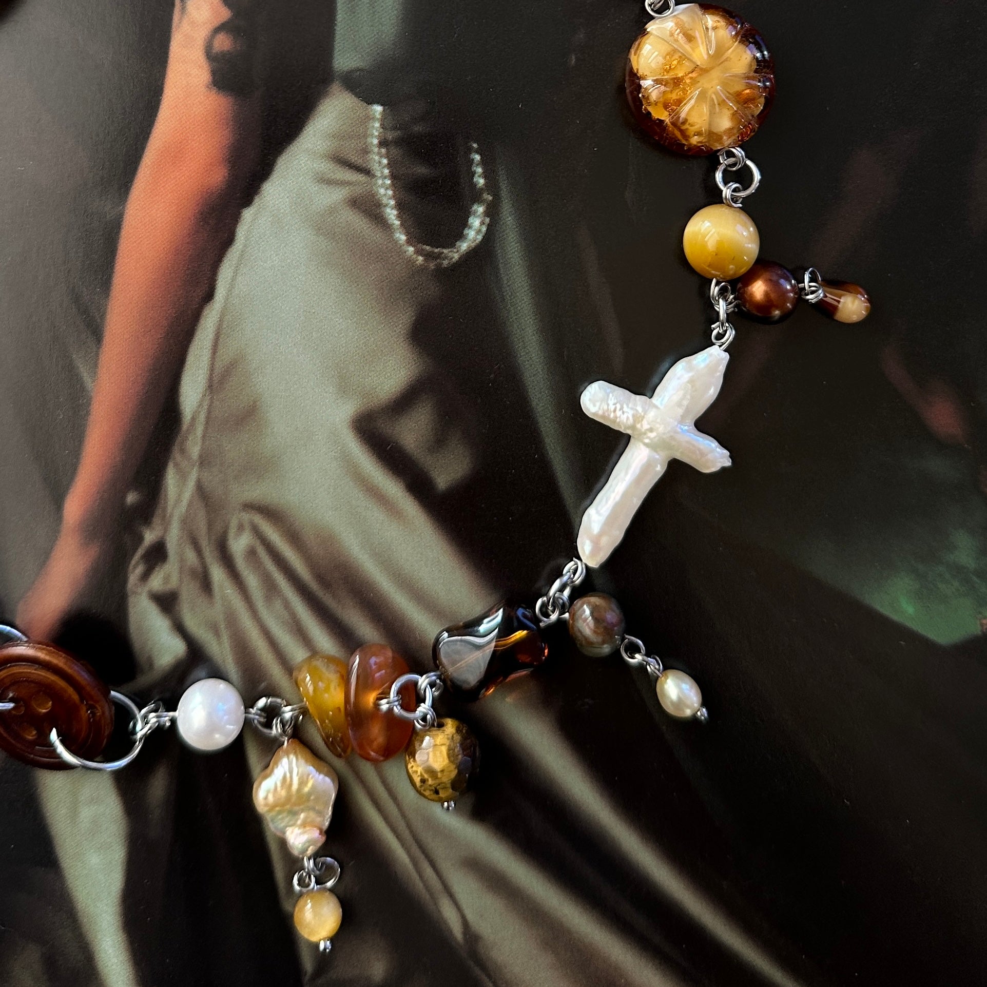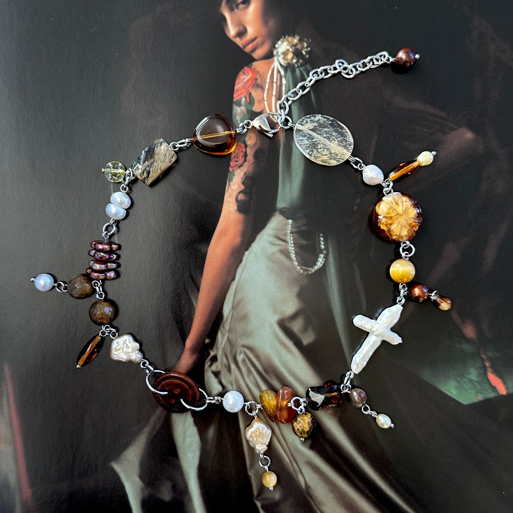 Beautiful one of a kind necklace is made of high quality stainless steel hardware, tigers eye, freshwater pearls, Murano/ glass hardware, and a repurposed button.