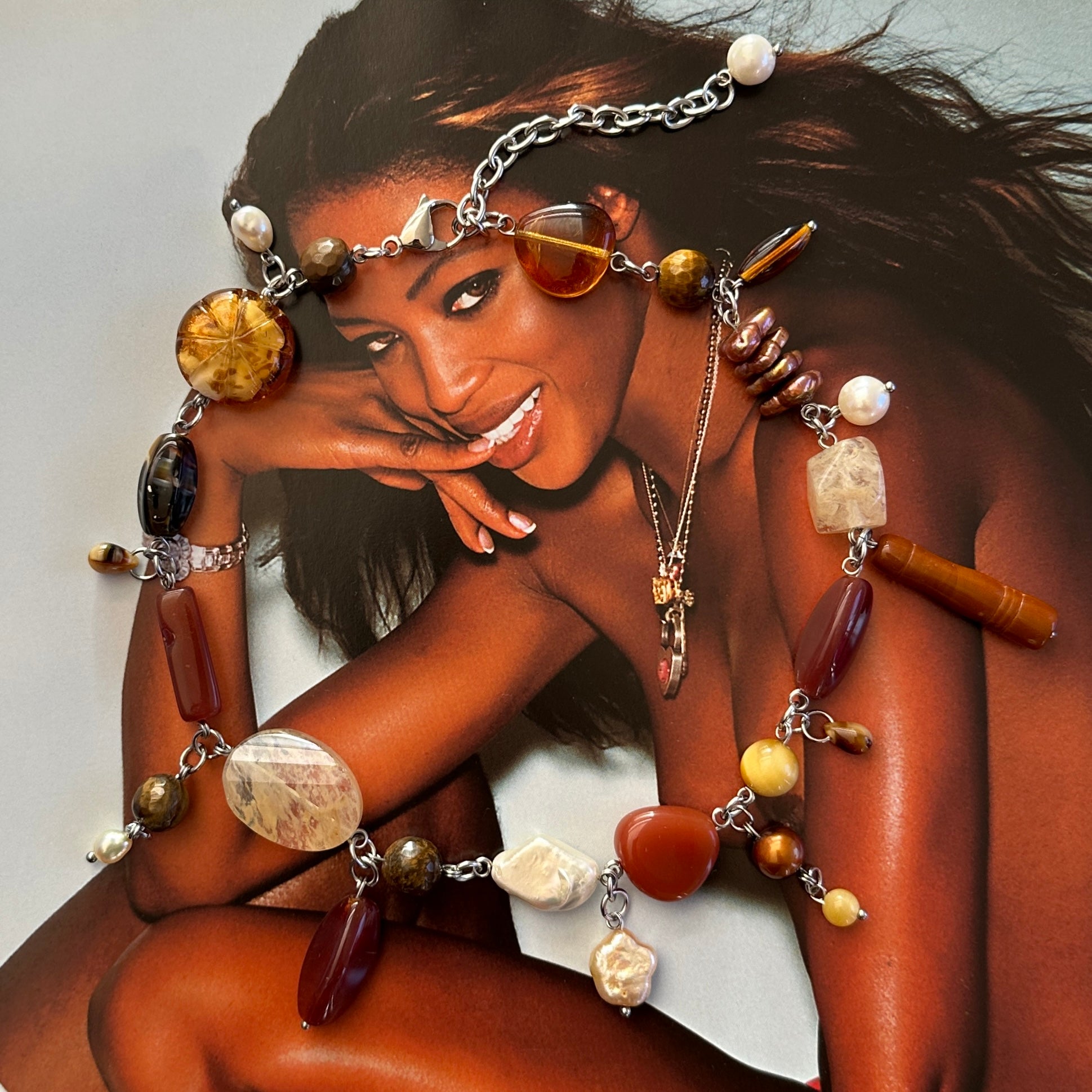 Beautiful one of a kind necklace is made of high quality stainless steel hardware, tigers eye, freshwater pearls, and Murano/ glass hardware.