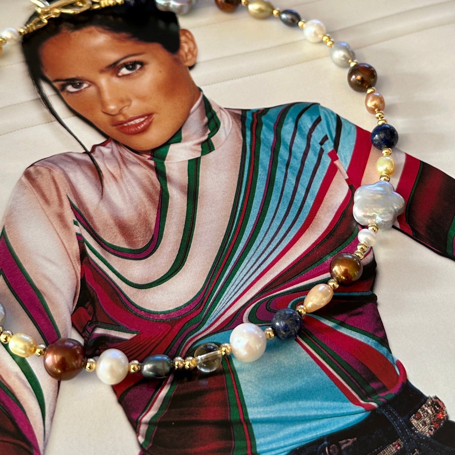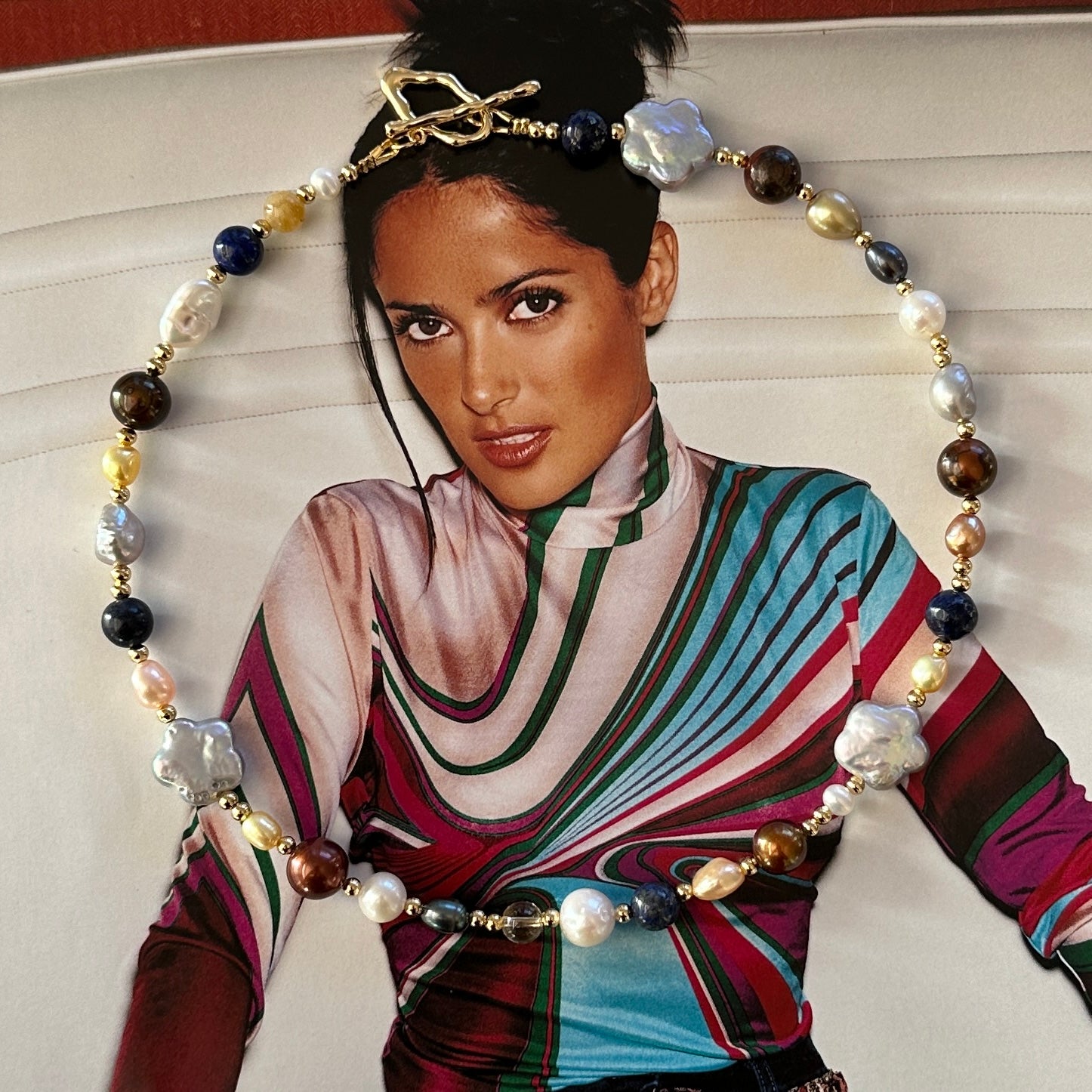 This beautiful 1 of 1 necklace made with high quality assortment of genuine freshwater pearls, lapis, tigers eye, and goldfilled beads and hardware.